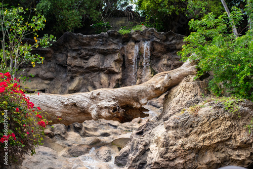 Fototapeta premium Lush tropical waterfall with fallen tree trunk surrounded by vibrant vegetation