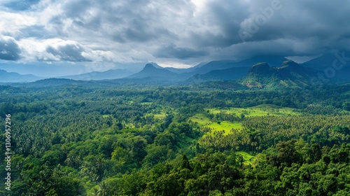 Fototapeta premium Lush valley, mountain range, cloudy sky, aerial view