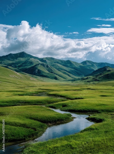 © Zoom, Fototapeta premium Lush valley, mountains, clear stream