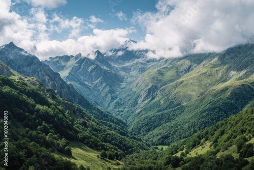© Es, Fototapeta premium Lush valley nestled amidst towering mountains under a partly cloudy sky