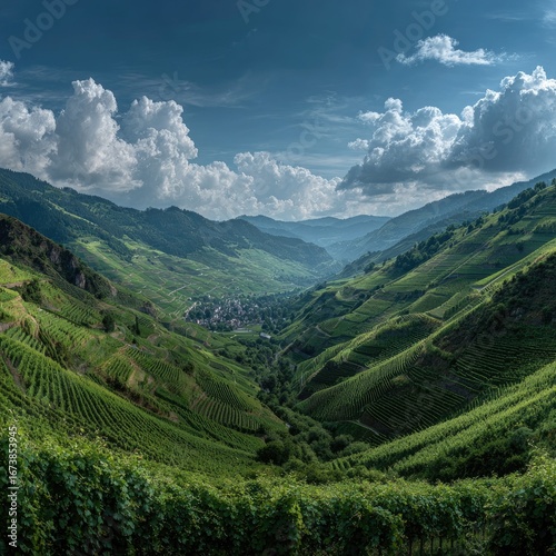 © Blen, Obraz premium Lush valley with rolling hills and clouds