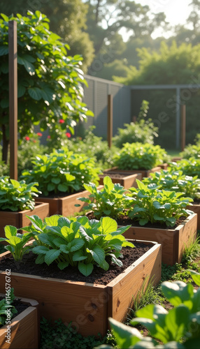 Fototapeta premium Lush vegetable garden with vibrant plants growing in wooden raised beds