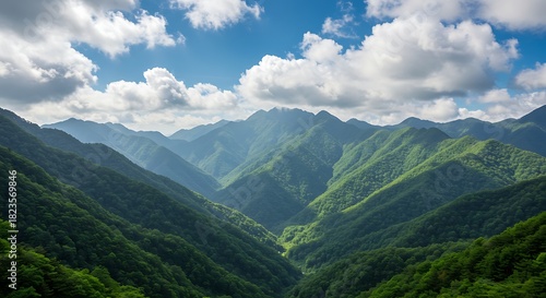 Fototapeta premium Lush, verdant mountain range under a bright blue sky dotted with puffy, white clouds, with deep valleys