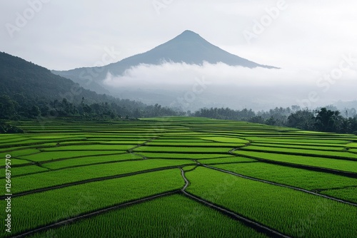 © tuiphotoengineer, Obraz premium Lush verdant organic rice paddies stretching across a rolling terraced landscape with a misty ethereal mountain backdrop in a serene picturesque rural setting
