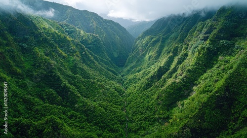 © Andi, Fototapeta premium Lush, verdant valley carved by mountains.