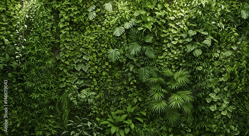 © Ganang, Fototapeta premium Lush vertical garden wall featuring diverse foliage.