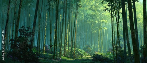 Fototapeta premium Lush, vibrant bamboo forest bathed in soft light