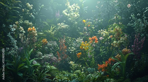 Naklejka premium Lush, vibrant flowers and foliage bathed in soft, ethereal light.