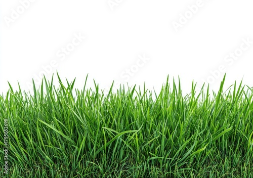 Fototapeta premium Lush, vibrant green grass blades form a horizontal border against a stark white background