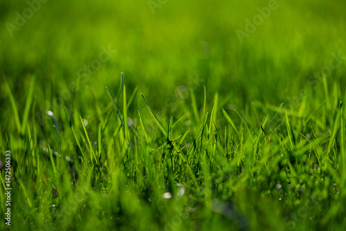 Fototapeta premium Lush, vibrant green grass blades reach towards the sunlight, creating a...