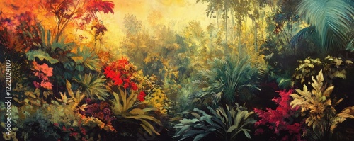 Obraz premium Lush vibrant jungle landscape with colorful foliage at sunset