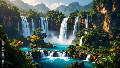 Fototapeta premium Lush, vibrant jungle scene with cascading waterfalls and turquoise pools