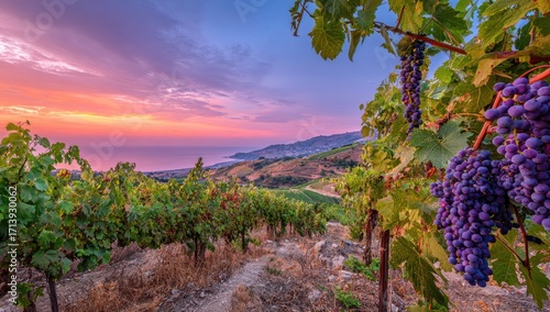 © Sitti, Naklejka premium Lush vineyard at sunset over a coastal vista