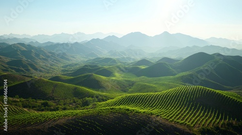 © novanda, Fototapeta premium Lush vineyard hillsides stretch across a mountainous landscape