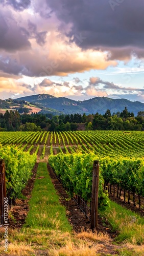 Fototapeta premium Lush vineyard landscape at sunset