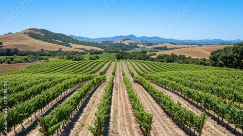 Fototapeta premium Lush vineyard landscape in sunny countryside with rolling hills and clear blue sky