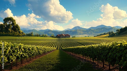 Fototapeta premium Lush Vineyard Landscape Under Blue Sky with Clouds and Mountains