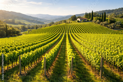 Obraz premium Lush vineyard landscape under the morning sun in rolling hills