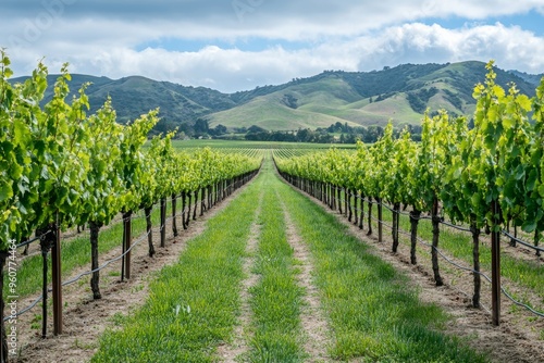 Naklejka premium Lush vineyard rows against scenic rolling hills under cloudy sky