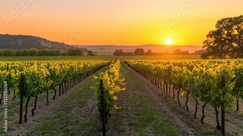Fototapeta premium Lush vineyard rows glow in warm orange sunset over serene countryside landscape