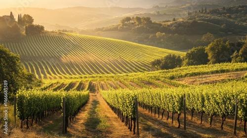 © gentho, Naklejka premium Lush vineyard rows stretch across rolling hills at sunrise