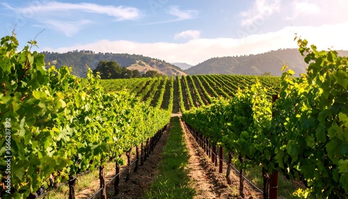 Naklejka premium Lush vineyard rows stretch into a sunlit valley