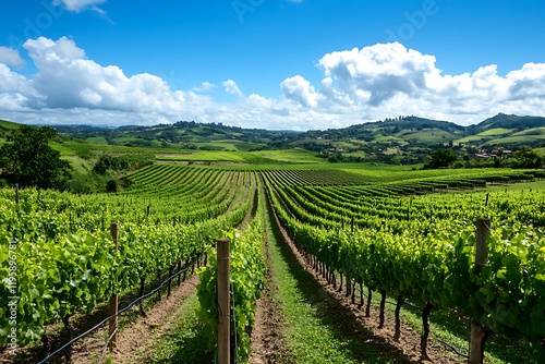 Fototapeta premium Lush vineyard rows stretching across rolling hills under blue sky
