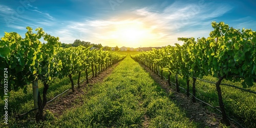 Naklejka premium Lush vineyard stretches towards a golden sunset