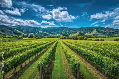 © Hinata, Fototapeta premium Lush vineyard stretching to distant mountains under a dramatic, blue, cloud-filled sky