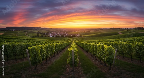 © Imtiaz, Naklejka premium Lush vineyard valley under golden evening skies - view 180