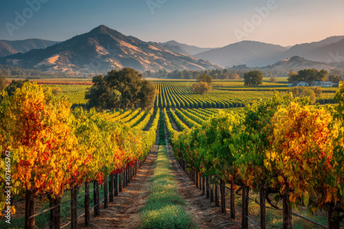 Naklejka premium Lush vineyard with neat rows of grapevines glowing in golden sunlight