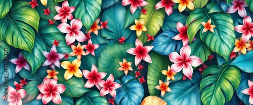 Naklejka premium Lush watercolor tropical leaves, vibrant blooms, overflowing with nature's...
