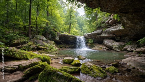 © cantika, Obraz premium Lush waterfall cascading into a tranquil pool beneath a rock overhang. Dense forest surrounds the scene