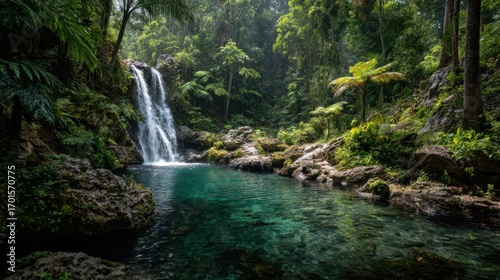 Fototapeta premium Lush waterfall cascading into a tranquil pool in a dense rainforest