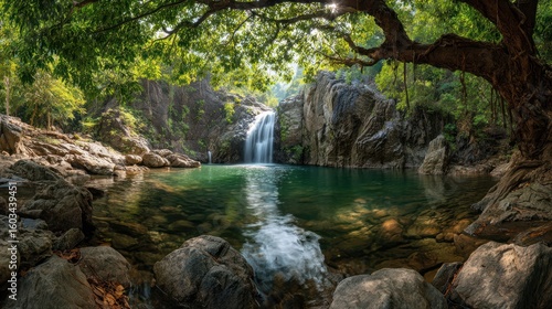 Fototapeta premium Lush waterfall cascading into a tranquil pool, shaded by a large, ancient tree
