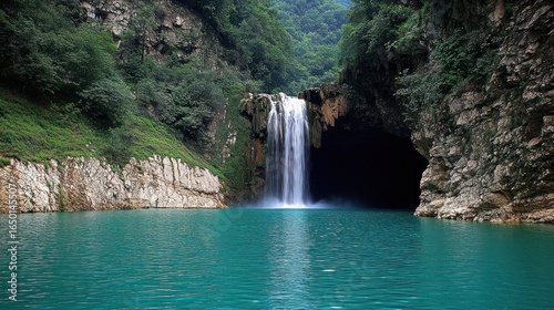 Naklejka premium Lush waterfall cascading into a tranquil turquoise lake, framed by dramatic,...