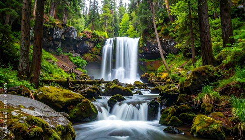 Naklejka premium Lush waterfall cascading through a mossy forest