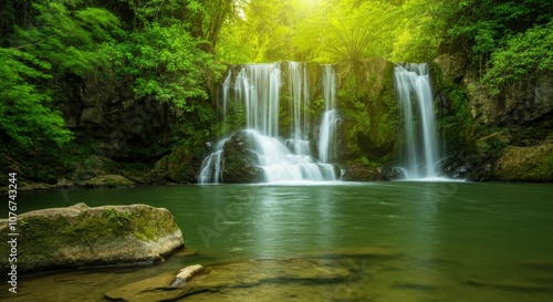 © Rizka, Obraz premium Lush Waterfall in a Tranquil Forest