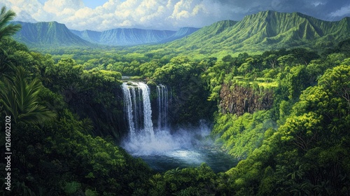 © Zeva, Fototapeta premium Lush Waterfall in Tropical Valley, Dramatic Mountains Background, Nature Scene, Travel Poster