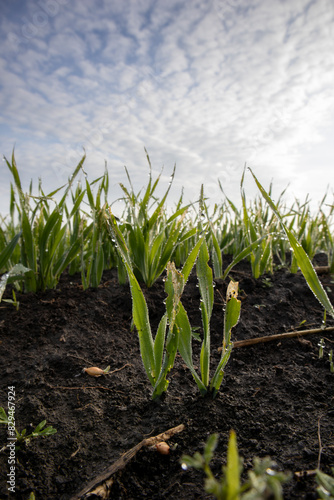 © malshak_off, Obraz premium Lush wheat seedlings in rich soil under a clear blue sky with morning dew drops