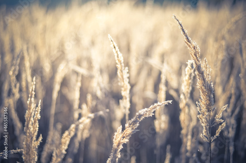 © Roman, Fototapeta premium Lush yellow-brown panicles of ears of wild grass close-up in the contoured light of the sun at dawn. Tinted natural background.