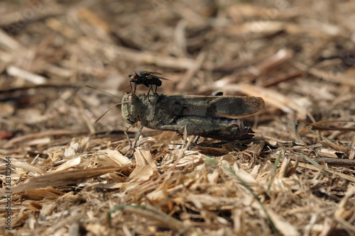 © Westwind, Obraz premium Lustiges Tierfoto mit Fliege auf einer Heuschrecke - Stockfoto