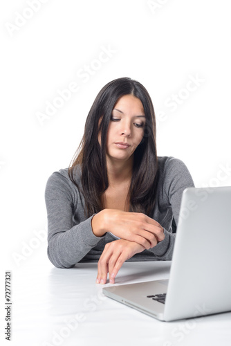 © Lars Zahner, Fototapeta premium Lustlose Frau im Büro schaut auf ihre Uhr