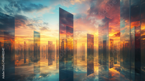 © Sawyer0, Fototapeta premium Lustrzane ściany labiryntu przechwytują żywe kolory zachodu słońca, wzmacniając wrażenie nieskończoności i tajemnicy.