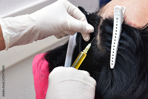 Fototapeta premium Łuszczyca. Owłosiona część głowy. Wstrzyknięcie osocza. Leczenie ludzkiej...
