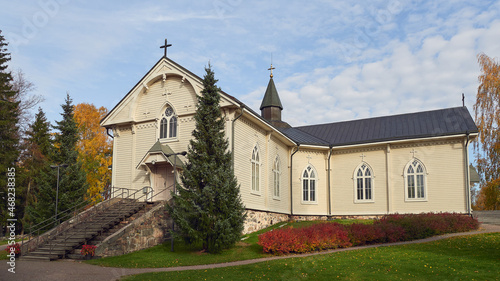 Fototapeta premium Lutheran Church in the Finnish town of Askola: autumn, colorful trees, sunny...