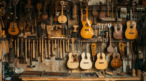 © touseef, Naklejka premium Luthier tools hanging on wall, workshop of a master craftsman with guitar making equipment and precision instruments, concept of craftsmanship and musical instrument repair, close-up of string instrum