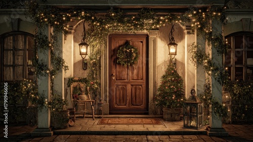 Fototapeta premium lux front porch entry door christmas tree warm lights garland lantern festive cozy welcoming holiday decor charming rustic home exterior night elegant seasonal inviting warm glow entrance wreath sant