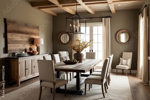 Fototapeta premium Luxe Farmhouse Dining Room with Reclaimed Wood Elements and Earthy Tones