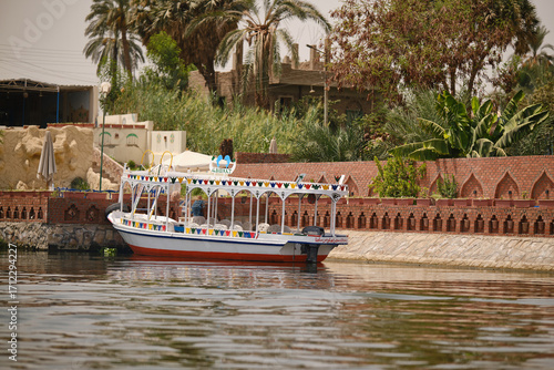 Fototapeta premium Luxor, Egypt- August 13, 2025: Colorful tourist boats on the Nile River in Egypt.
